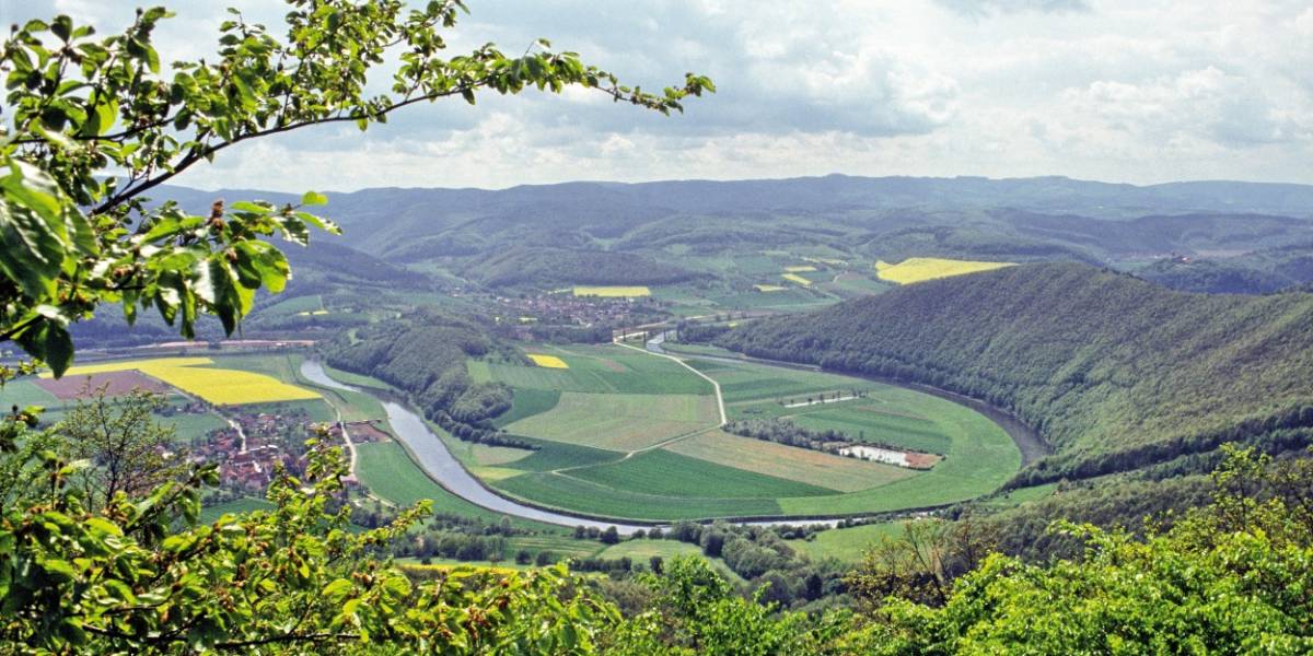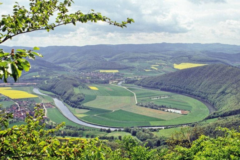 Gut zu sehen ist die hufeisenförmige Flussschleife der Werra, an der Ihr Zielort dieser Streckenwanderung liegt. Das Stockmacherdorf befindet sich genau an der Grenze zwischen Hessen und Thüringen.