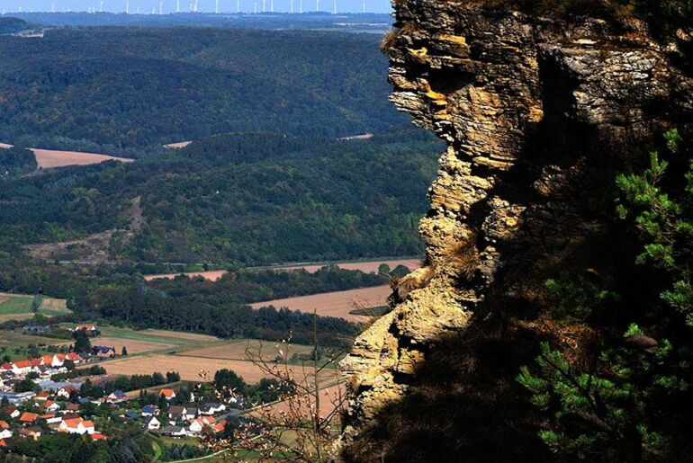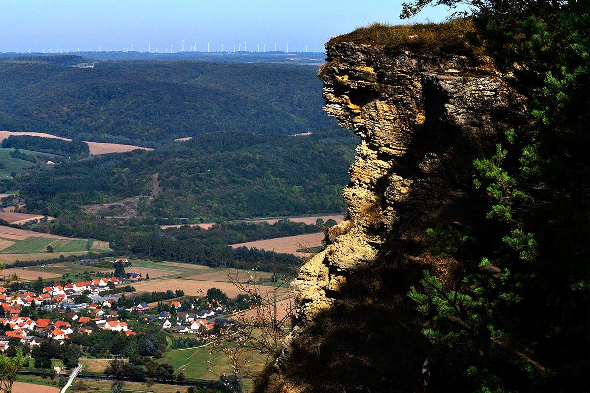 Über das „Blaue Wunder“, einem ehemaligen Werrasperrwerk der Grenztruppen, wandern Sie auf dem Kolonnenweg bergauf zum Sattel Schnellmannshausen. Ein schmaler Pfad führt Sie über Treppen und durch Steinklippen zum 503 Meter hohen Heldrastein.