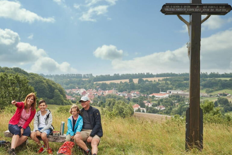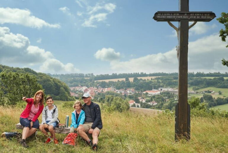 Leicht bergab, an Wiesen und Feldern vorbei, bezaubert nun der Galgenkopf mit seinem Rundumblick. Die Wanderroute führt Sie weiter zum Dorfrand von Kreuzebra, eines der ältesten Dörfer des Eichsfeldes. Nach dem Hasengrund mit seiner malerischen Allee, haben Sie den sanft ansteigenden Weg zur Burg Scharfenstein fast geschafft. Hier bietet sich Ihnen ein sagenhafter Weitblick ins Eichsfeld, auf das Ohmgebirge und bis hin zum Harz.