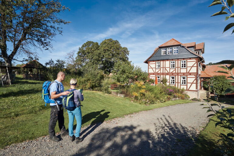 Einkehr Alte Schmiede, Dorfstr. 21, 37318 Asbach, Tel. 036087 90074, www.asbach-uraltschmiede.de Hof Sickenberg, Hofcafé, Sickenberg 9, 37318 Asbach-Sickenberg, Tel. 036087 97696, www.hof-sickenberg.de Übernachtung: Alte Schmiede, Ferienwohnungen, Dorfstr. 21, 37318 Asbach, Tel. 036087 90074, www.asbach-uraltschmiede.de Hof Sickenberg, Pension Sickenberg 9, 37318 Asbach-Sickenberg, Tel. 036087 97696, www.hof-sickenberg.de Weitere Übernachtungsmöglichkeiten: www.naturparkfrauholle.land , www.eichsfeld.deInteraktive Karte